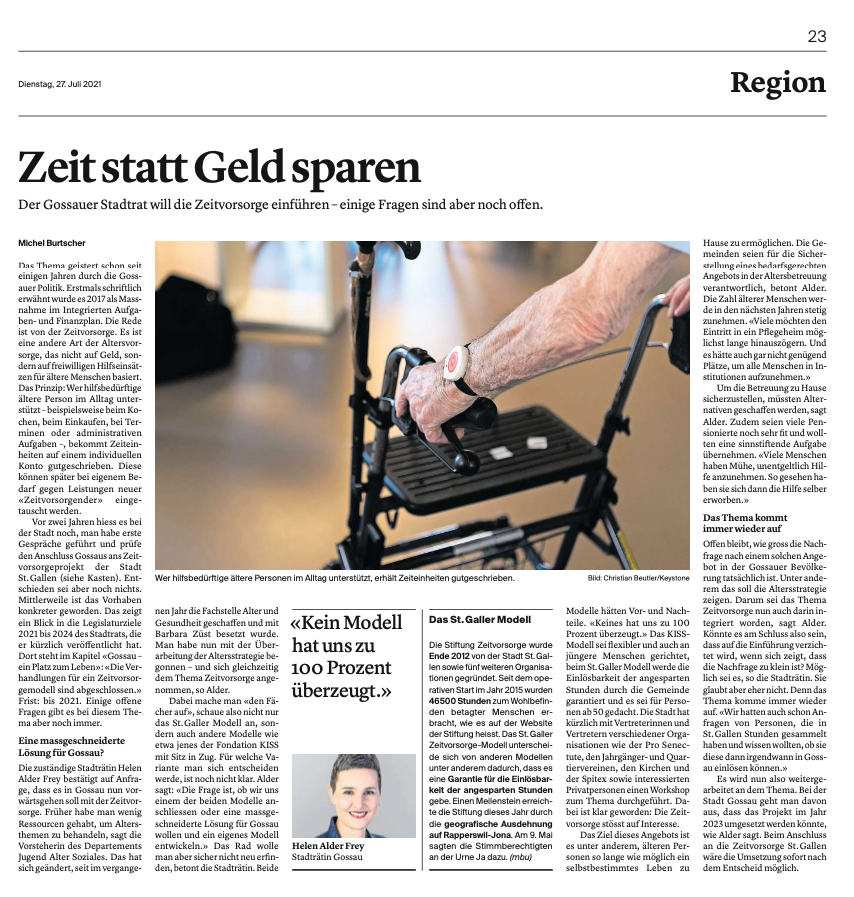Damit ältere Menschen möglichst lange zu Hause leben können, setzt Rapperswil-Jona als zweite Stadt im Kanton auf das Modell Zeitvorsorge: Freiwillige unterstützen Betagte im Alltag – und können diese Stunden einlösen, wenn sie später selbst Hilfe brauchen.